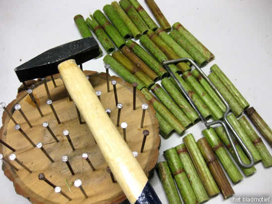 - Start met het kloppen van de keepernagels in de houtschijf. Hoe dichter je de polygonumstokken tegen elkaar wilt, hoe meer nagels je nodig hebt.