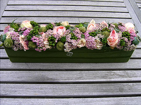 De bloemen zijn verwerkt in een eenvoudig recipiënt (gewoon rechthoekig schaaltje) maar het frisgroen oogt wel leuk met het roze van de tuinbloemen. De groene zaaddozen zijn juist gebruikt om het roze te breken én om het groen van het recipiënt te laten terug keren. Een kleur herhalen geeft meer harmonie in een bloemstuk. Daarom hou ik van groene recipiënten. Ze zijn in elk seizoen bruikbaar, aangezien je in elk seizoen groenvulling vindt.