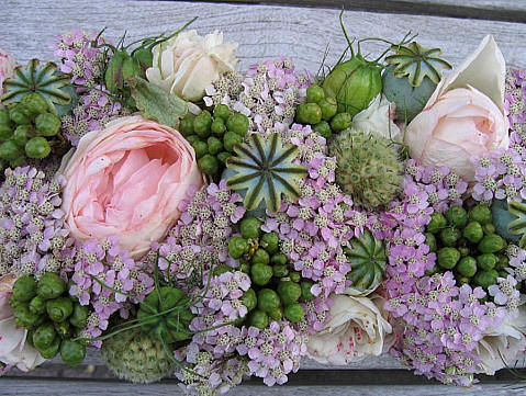 voor dit bloemstuk worden bloemen uit de tuin gebruikt: Rosa 'Bouquet Parfait' en Rosa 'Pierre de Ronsard', Achillea millefolium ‘Lilac Beauty’ en zaaddozen van Cephalaria, van juffertje in ’t groen (Nigella damascena) en van Sisyrinchium striatum