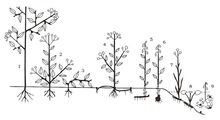 Foto: De verschillende levensvormen van Raunkiær. 1= Fanerofyt; 2-3= Chamaefyt; 4= Hemikryptofyt; 5-6= Geofyt; 7= Helofyt; 8-9= Hydrofyt.