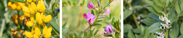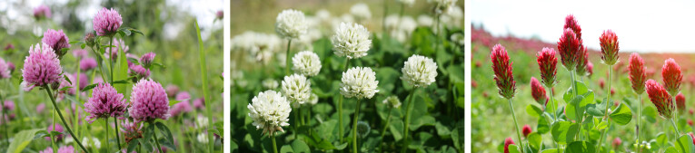 Soorten vlinderbloemigen: klaversoorten zoals rode klaver (Trifolium pratense), witte klaver (Trifolium repens) en inkarnaatklaver (Trifolium incarnatum), gele lupine (Lupinus luteus) of blauwe lupine (Lupnius angustifolius), voederwikke (Vicia sativa), veldboon (Vicia faba), luzerne (Medicago sativa).