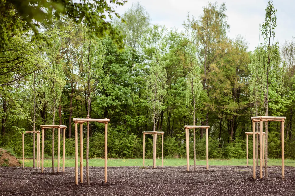 Indien we de boom steunen met een driepikkel (drie boompalen), dan kunnen we de boomsteun plaatsen nadat we de boom hebben geplant. Gebruik het juiste materiaal om de bomen vervolgens aan te binden. Gebruik boomrubbers of boomband, deze dienen we jaarlijks te controleren zodat ze in geen geval in de stam kunnen ingroeien.