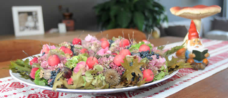 In het najaar kan je vanalles vinden om de herfstschaal aan te kleden: herfstbladeren, noten, bolsters van de tamme en wilde kastanje, sierappeltjes, gedroogde bloemknoppen, bessen, zaden, dennenappels,... een ruime keuze waarmee je eindeloos kunt combineren.