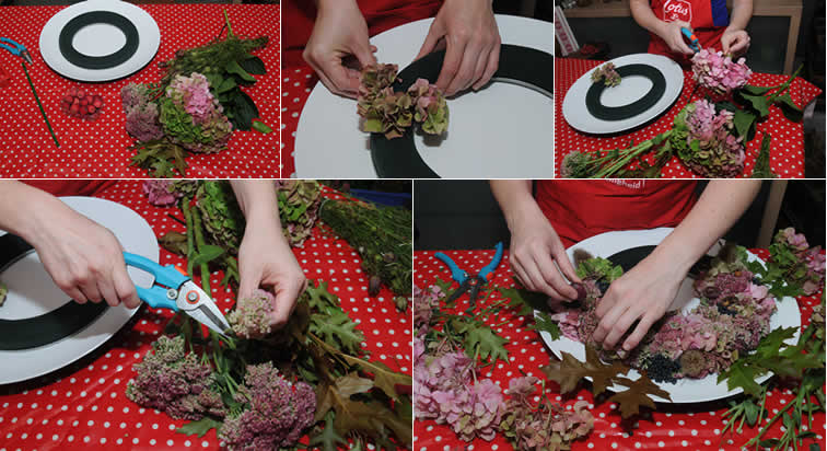 3. Steek de krans vol met Hortensia, Sedum en besjes. Zorg ervoor dat er geen steekschuim meer zichtbaar is.