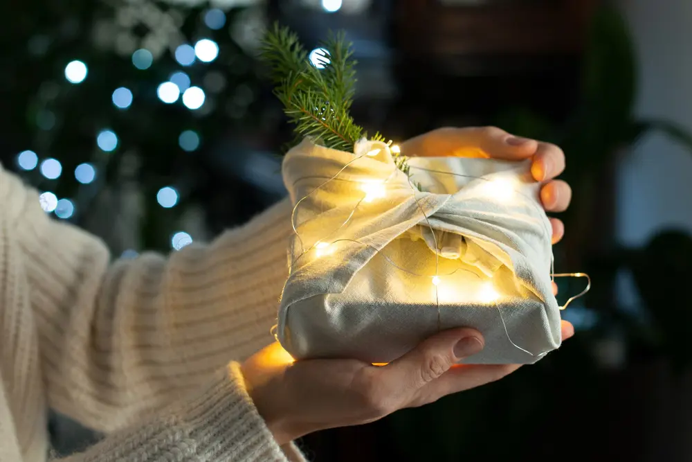 Ga dit jaar eens voor iets anders dan papier en kies voor een duurzame verpakking zoals een leuk stukje stof (met of zonder print). Wikkel het pakje in het doek en knoop het dicht. Klaar is kees! Deze knoopdoek noemt furoshiki en komt van Japan.