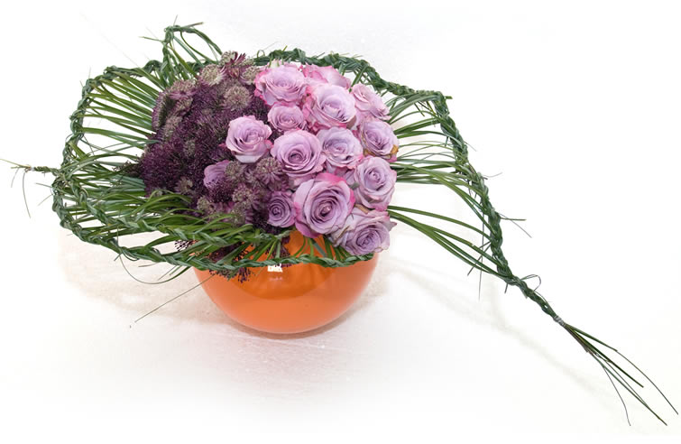 - Maak een boeket van je bloemen. Op de foto zijn de bloemen niet gemengd maar werden de rozen aan de ene kant geschikt en de Astrantia en Trachelium aan de andere zijde van het boeket. Je kan de bloemen natuurlijk ook door elkaar schikken.