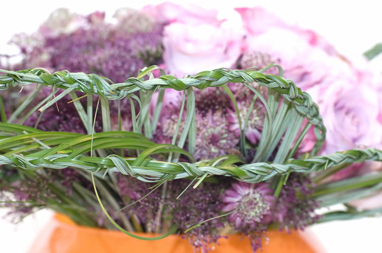 - Vlecht het berengras in verschillende lagen. Begin met 6 grasjes (3x2) en maak een vlecht. Werk de andere grasjes systematisch in de vlecht zodat je één geheel krijgt.