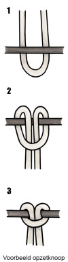 - Span de knopen opnieuw voorzichtig aan door het garen zo dicht mogelijk aan de knoop vast te nemen en aan te spannen. Zorg dat het uiteinde niet zichtbaar is aan de voorkant en span de knoop dus lichtjes langs achteren naar boven op.