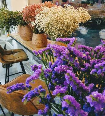 - Bloemen naar keuze om de hoepel te versieren: Limonium, Gypsophila (verkrijgbaar in diverse kleuren), Prunus bloessems, meiklokjes, Alchemilla mollis, Bupleurum, Pennisetum...