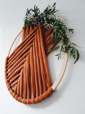 Fleur de macramé hoepel op en werk af met planten en bloemen. Combineer diverse bladplanten en bloemen. Kies waar je de bloemen zal verwerken en wees creatief! Pluk het teveel aan blad van de tak. Knip de steel schuin zodat er een fijne punt ontstaat en schuif de plant voorzichtig in de wol. Vul hem tenslotte op tot je het gewenste resultaat hebt. Geef hem nog een leuk plaatsje in je interieur of hang hem aan de muur!