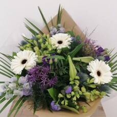 Boeket Violetta XL - blauw-paars-wit Het boeket is samengesteld uit verschillende bloemen waaronder Alstroemeria, Ageratum, Allium, Delphinium, Kruisdistel, Eustoma, Lilium en Gerbera. Om het boeket meer kleur en volume te geven, wordt het afgewerkt met bladgroen zoals Asparagus, dwergdadelpalm, appeltjesblad en Australische laurier. (, vanaf € 34,95) |