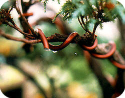 Wikkel de draad ten minste één maal rond de stam, het beste is om dit twee keer te doen om te zorgen dat de draad niet gaat verschuiven. Wikkel het draad altijd in een hoek van ongeveer 45 graden om de stam / takken! Op deze manier groeit de draad er niet in.