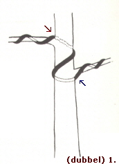 “Duo bedrading”: het bedraden van twee takken, die op verschillende hoogte zitten en ongeveer even dik zijn, met één draad. (afbeelding dubbel 1)