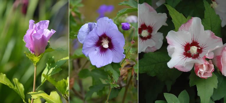 Aan kleuren geen gebrek: wit, diepblauw, licht- en donkerpaars, rood, al dan niet met contrasterende tekeningen en fascinerende vlekken in de bloemen, en grote, opvallende meeldraden. Aan de bloemen zie je dat hibiscus familie is van de Malvaceae, waaronder ook Lavatera, Malva en stokrozen vallen, maar dan in een grotere, vollere en meer exotische versie. De bekendste is ongetwijfeld de rozelila ‘Oiseau Bleu' en ‘Hamabo’, met roze bloemen met een prachtig wijnrood hart. Je hebt er ook met dubbele bloemen, zoals ‘Blue Chiffon’ en ‘Lavender Chiffon’. ‘Woodbridge’, met heel grote, donkerroze bloemen, is erg populair in Engelse tuinen. Hibiscussen durven zich wel eens uit te zaaien; dan krijg je nieuwe plantjes die meestal blauw bloeien. Maar al dat zaad produceren, kost energie; nieuwe, steriele soorten zoals de Belgische reeks 'Belli Colori' zaaien zich niet uit en bloeien dan ook beduidend langer. Cielo kleurt lichtpaars, Rosso heeft rozerode bloemen, Pastello bloeit licht pastelroze, Bianco spierwit en Azurri blauwpaars.