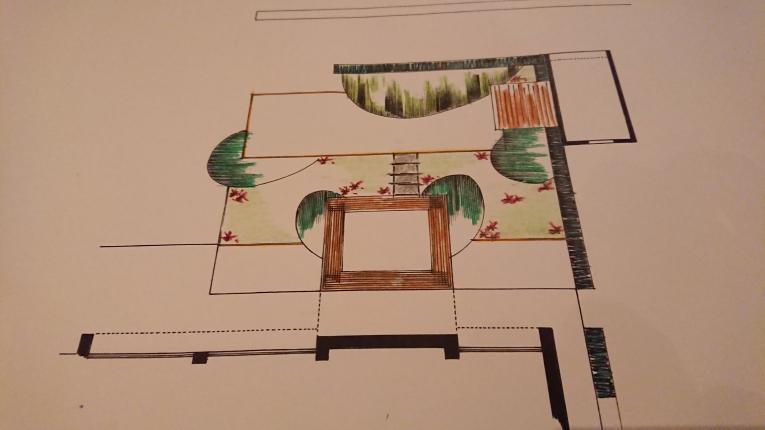 Een leuk idee...maar vooral veel verharding die een arbeidsintensieve ingreep vraagt. Bovendien, als resultaat, een verzameling van terrassen waarvan er in realiteit en volgens het leefpatroon van de klant waarschijnlijk slechts één zal worden gebruikt.